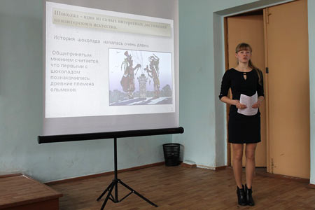 | Выступление с докладом "Это сладкое слово-шоколад" ученицы 10 класса Иконописцевой Елены |